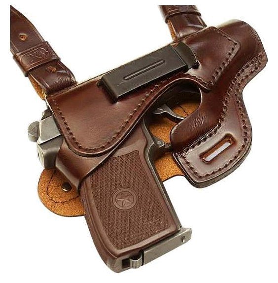 Темно-коричневая кобура выполнена из натуральной кожи. Точная ручная формовка облегает пистолет, плотно удерживая его внутри. Для большей надежности фиксации используется застежка с кнопкой. Модель представлена двумя способами ношения – поясным и наплечным.